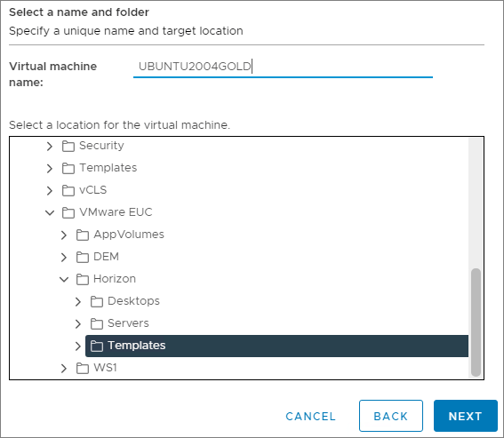 I give the Virtual machine a name, and select the location where the VM should to be placed, Next…