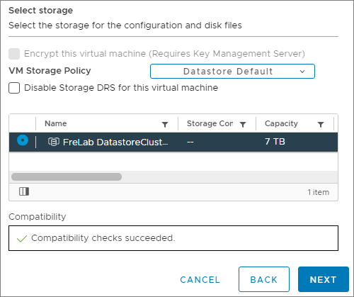 Select the Storage on where the VM will be placed, in my case my Datastore Cluster, Next…