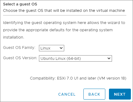 I select Linux as Guest OS Family and Ubuntu Linux (64-bit) as OS Version, Next…