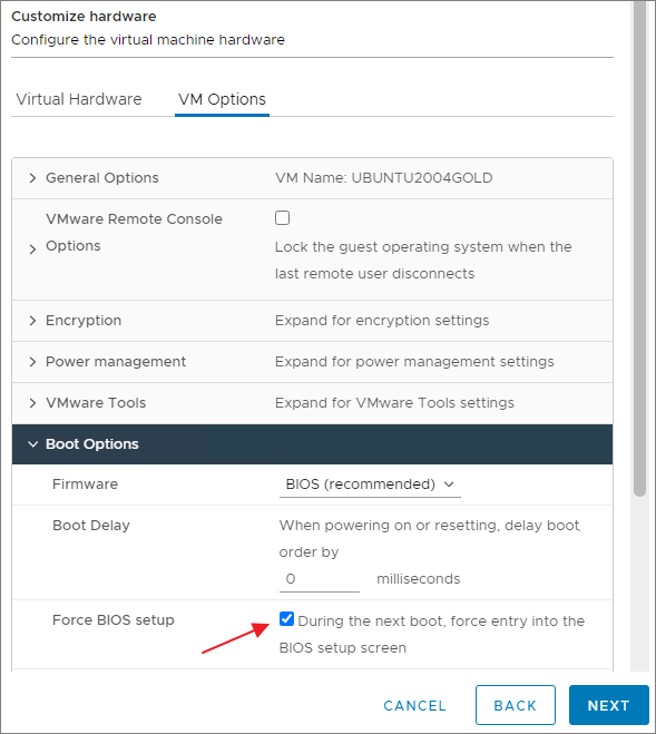 Under the second tab VM Options, I disable logging, select Boot Options and enable force BIOS setup. With this option enabled, I go straight into the BIOS of the VM after powering it on.
