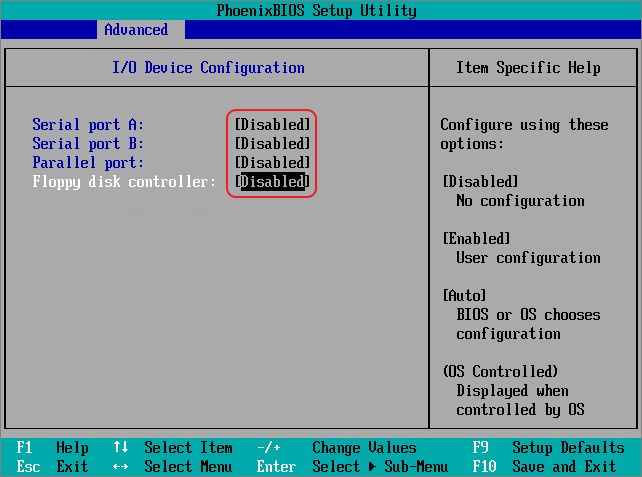 Within the advanced section, select I/O Device Configuration. I don’t need any of the I/O Devices, so we disabled them all. Press ESC to return to the BIOS main screen. Select Boot-Tab