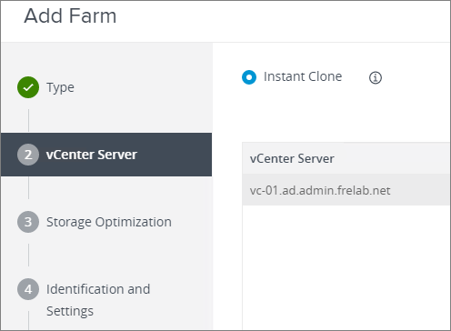 As with the Desktop Farm above, I will be creating an “Automated Farm“, using Instant Clones from my vCenter