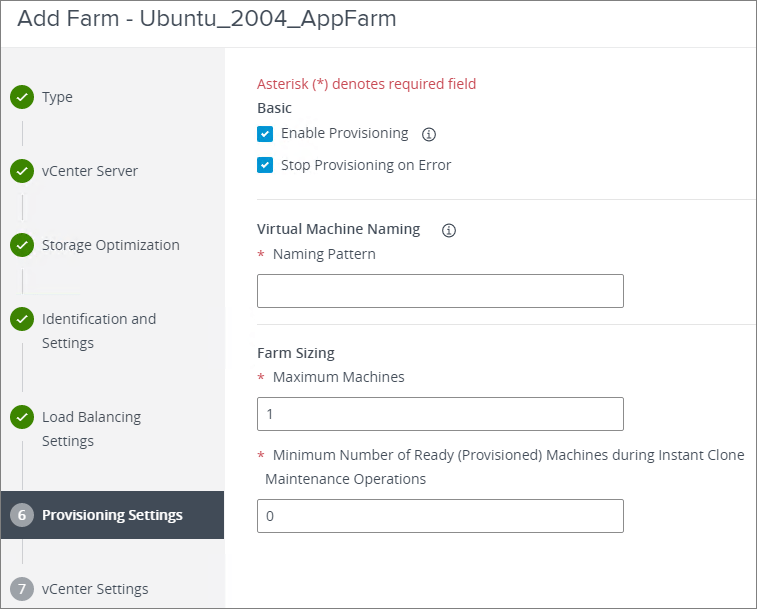 In the Provisioning Settings, I enter Virtual Machine naming patter and size, Next…