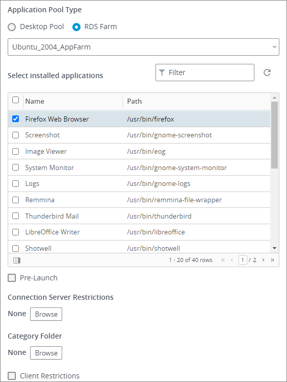 The Application Pool type for this session will be RDS Farm. I select the “Ubuntu_2004_AppFarm” I created above and now get a list of installed applications, from which I select “Firefox Web Browser”