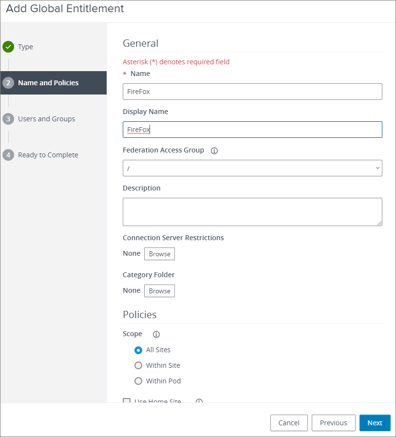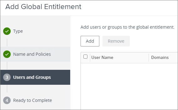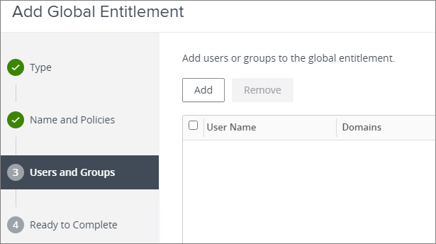 I will now create a Global Entitlement to my Application Pool. This is very similar to the entitlement I created for my RDS Desktop Pool above. From the Inventory menu, I select Global Entitlements and click Add to launch the “Add Global Entitlements-wizard”