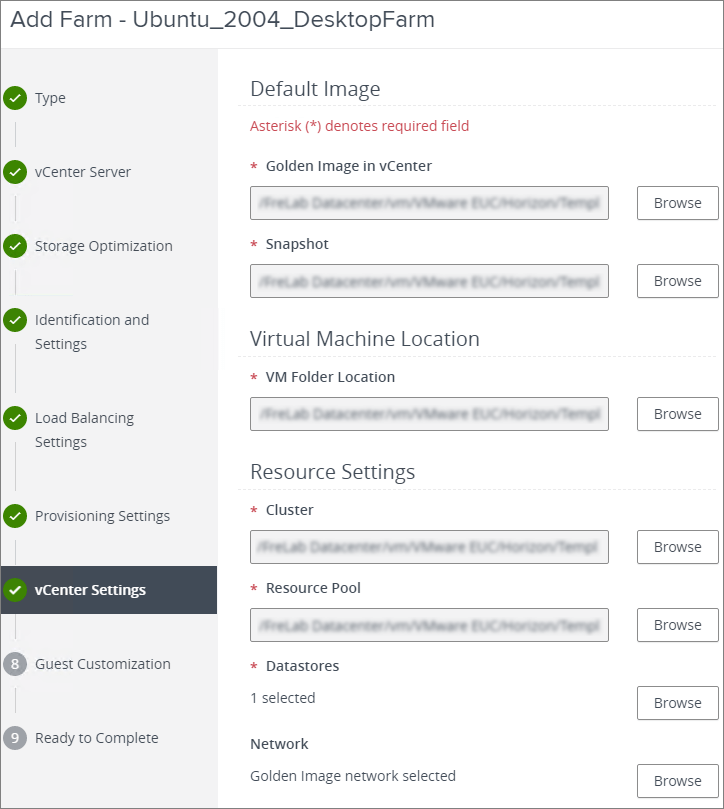In the vCenter Settings section, I point to the Golden Image I created for the Desktop Farm, snapshot and additional vCenter settings, Next…