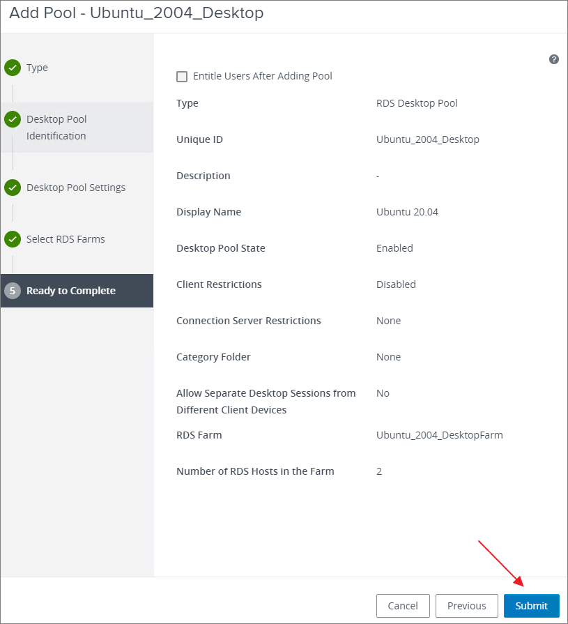 As I will be using Global Entitlement for this Desktop Pool, in the section below, I wont do any Entitlement when adding this pool. Happy with my decisions selected above, I hit Submit and proceed.