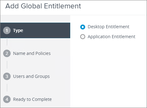 In the next screen we have the option to either create a Desktop or an Application Entitlement. I select Desktop Entitlement for this session.