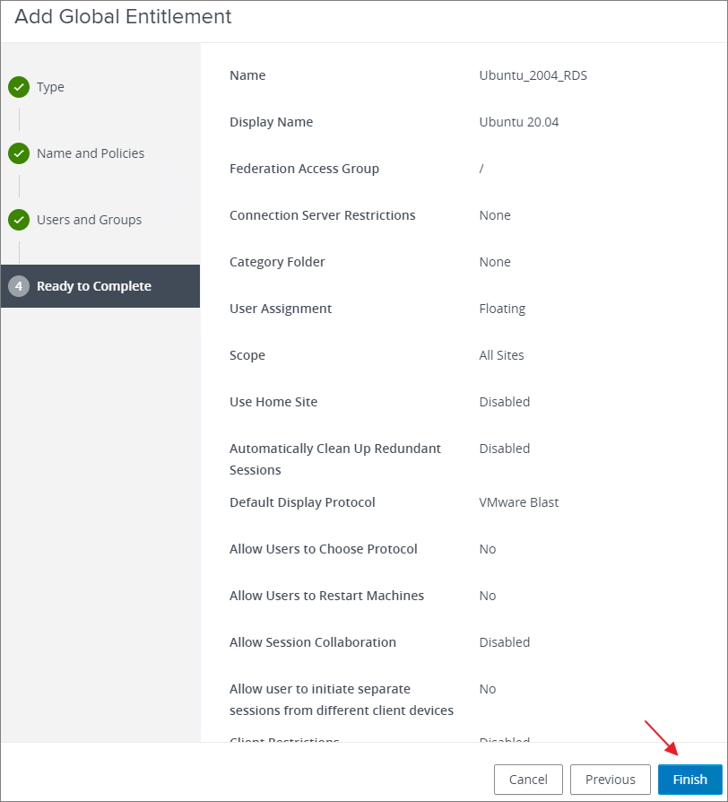 Having finished all my settings for this Global Entitlement, I click Finish…