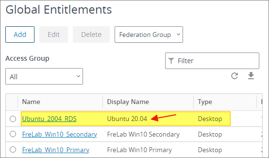 I now have myself a Global Entitlement named “Ubuntu 2004 RDS”, it’s now time to add the desktop pool to this entitlement. To do this I select the entitlement.