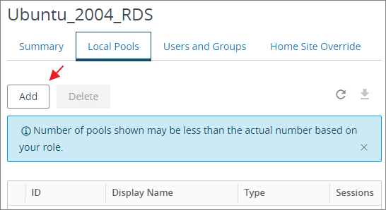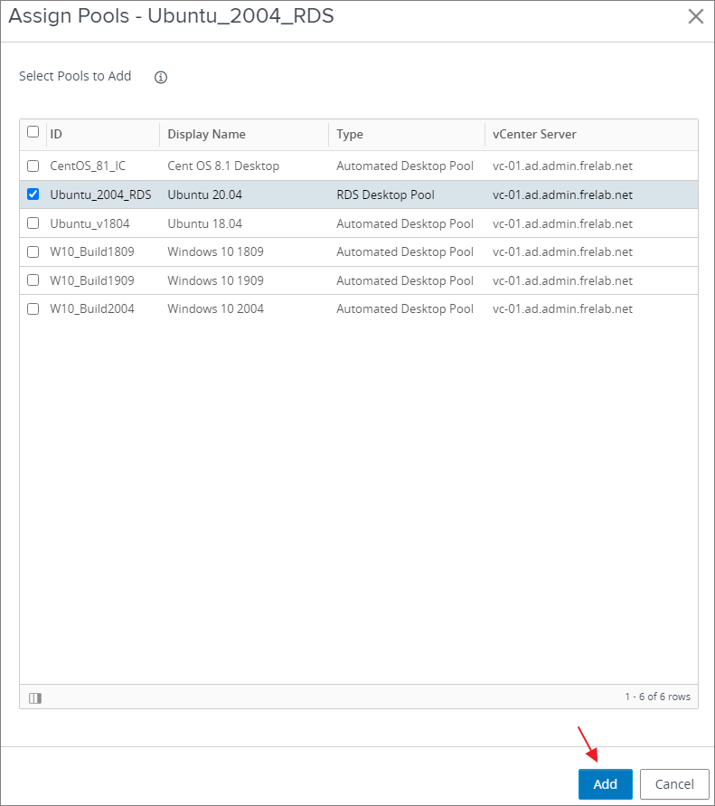 From the Local Pools tab I click “Add” and select the “Ubuntu_2004_RDS” desktop pool.