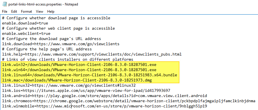 - Edit the “C:\ProgramData\VMware\VDM\portalportal-links-html-access.properties” file with new paths to client installation