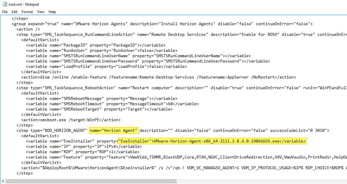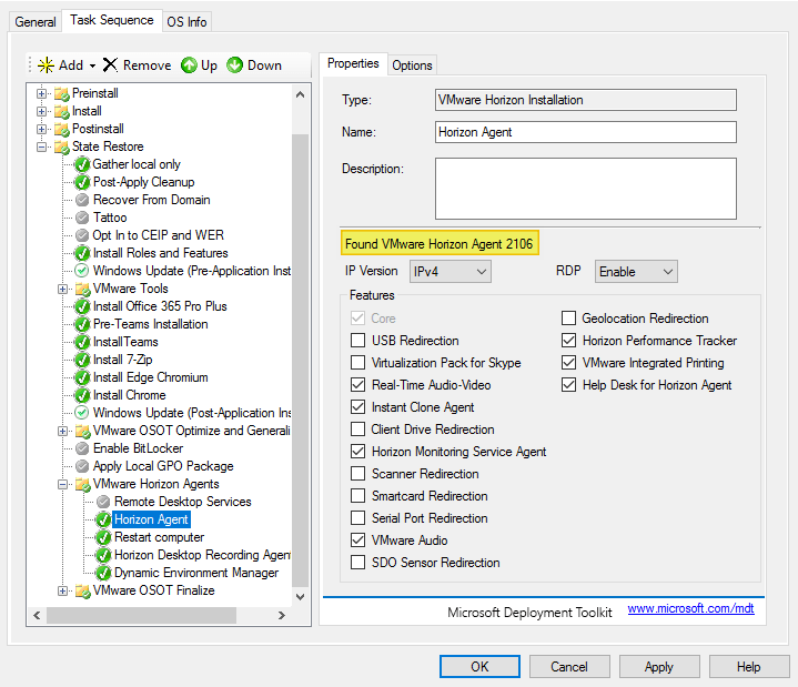 As I’ve gone over to using MDT to create templates, I will update the Horizon Agent in the Deployment Share and run through the task sequence to create a new template. Before I begin, I open the task sequence and can see that it has found the 2106 agent in the Deployment Share.