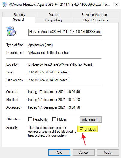 Next, I copy the new VMware Horizon Agent executable to the “HorizonAgent” folder in the Deployment Share. It is important to make sure that the executable isn’t blocked by Windows Security, therefore I right-click the exe-file, select Properties and tick the Unblock box, if it exists. This also applies to the other executable files under the “D:\DeploymentShare\VMware” folder.