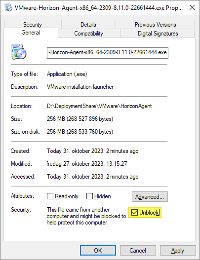 Next, I copy the new VMware Horizon Agent executable to the “HorizonAgent” folder in the Deployment Share. It is important to make sure that the executable isn’t blocked by Windows Security, therefore I right-click the exe-file, select Properties and tick the Unblock box, if it exists. This also applies to the other executable files under the “D:\DeploymentShare\VMware” folder.