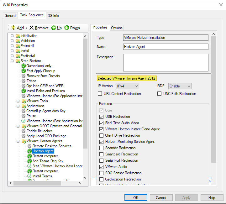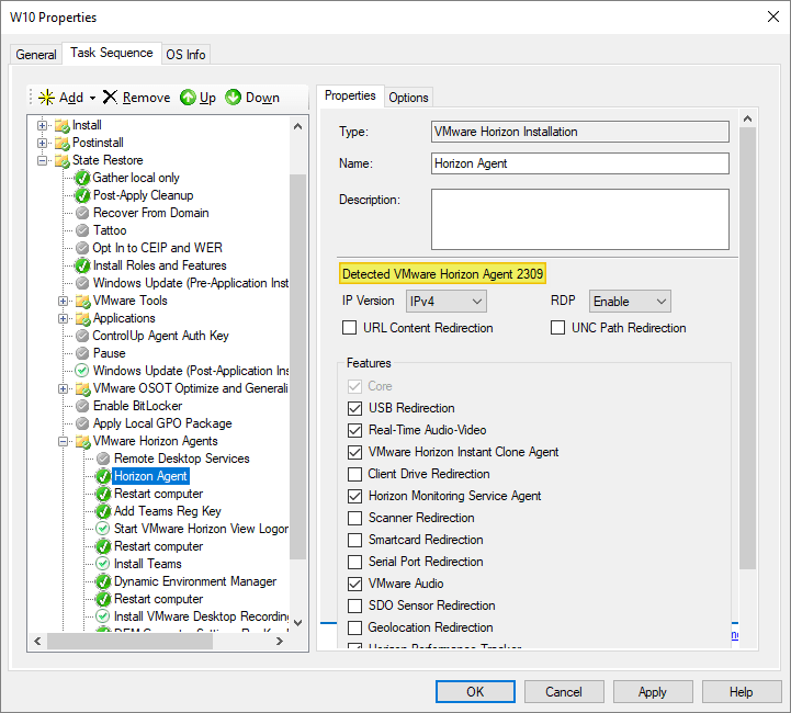 As I’ve gone over to using MDT to create Horizon templates, described here: Automating Template Creation & Maintenance, I will update the Horizon Agent in the Deployment Share, and run through the task sequence to create a new template. Before I begin, I open the task sequence and can see that it has found the 2309 Agent in the Deployment Share.