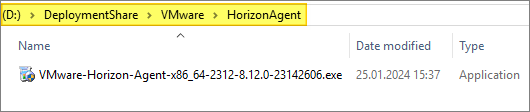 Next, I copy the new VMware Horizon Agent executable to the “HorizonAgent” folder in the Deployment Share. It is important to make sure that the executable isn’t blocked by Windows Security, therefore I right-click the exe-file, select Properties and tick the Unblock box, if it exists. This also applies to the other executable files under the “D:\DeploymentShare\VMware” folder.