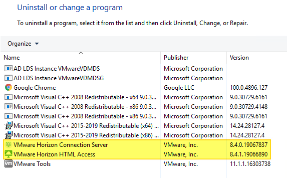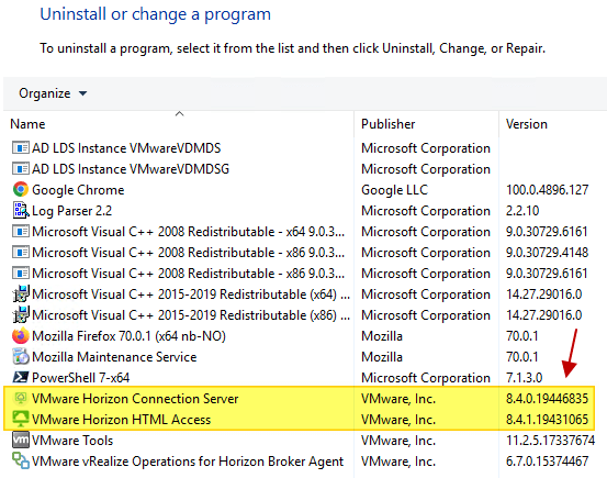 As I’m running Cloud Pod Architecture, I also check that replication between my connection servers are running smoothly, as described by VMware here: Forcing replication between ADAM databases This also applies to replica servers and became a problem when I was upgrading to 2111, documented here: VMware Horizon – Upgrade Horizon Connection Servers to v. 2111 Anyway, once I had sorted out the issue above, I could start the upgrade by first verifying the installed versions from Control Panel