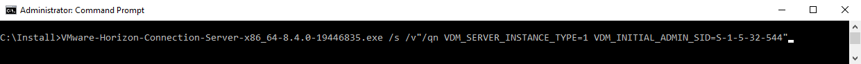 VMware-Horizon-Connection-Server-x86_64-8.4.0-19446835.exe.exe /s /v"/qn VDM_SERVER_INSTANCE_TYPE=1 VDM_INITIAL_ADMIN_SID=S-1-5-32-544"