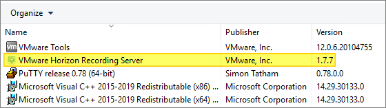 After the installation is done, I can verify in Control Panel the installed version and finish off by doing a reboot. Once rebooted I log back in and verify functionality in the VMware Horizon Desktop Recording server UI.