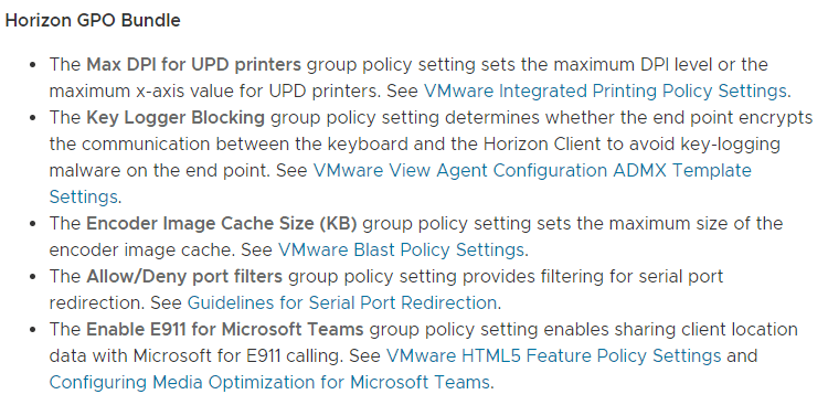 This is what VMware’s release notes say about the Horizon GPO Bundle