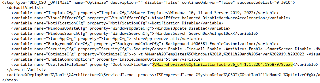I have to edit the osot.xml to verify the ExeInstaller property vs actual filenames for VMware Tools, Horizon/DEM Agents and OSOT. The App Volumes Agent isn’t referenced with version and will work even after updating the installer in the Deployment Share.
