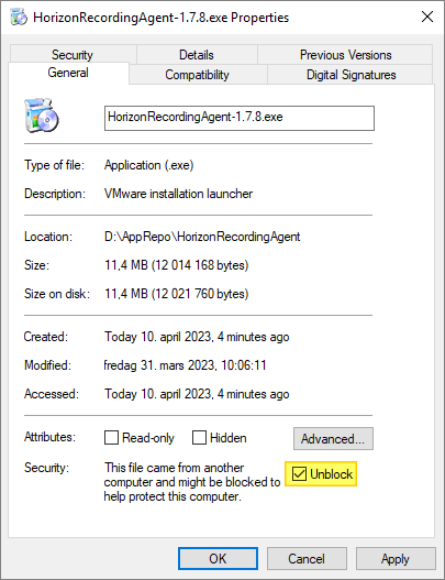 As the Horizon Recording Agent is an application in the Deployment-share, I upgrade this by adding in the new version as a new application. It is important to make sure that the executable isn’t blocked by Windows Security, therefore I right-click the exe-file, select Properties and tick the Unblock box, if it exists.