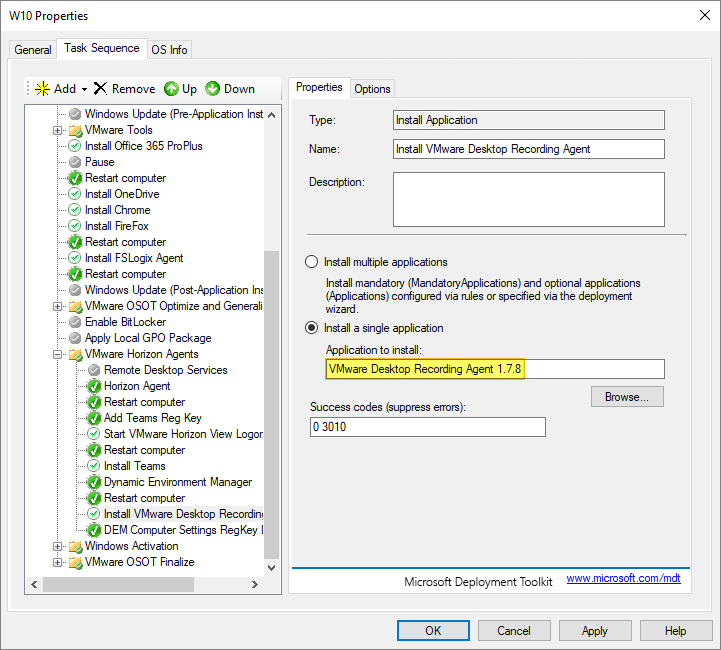 As I’ve gone over to using MDT to create Horizon templates, described here: Automating Template Creation & Maintenance, I will update the Horizon Recording Agent in the Deployment Share, and run through the task sequence, to create a new template. Before I begin, I open the task sequence and can see that it has found the 1.6.1 Agent in the Deployment Share.