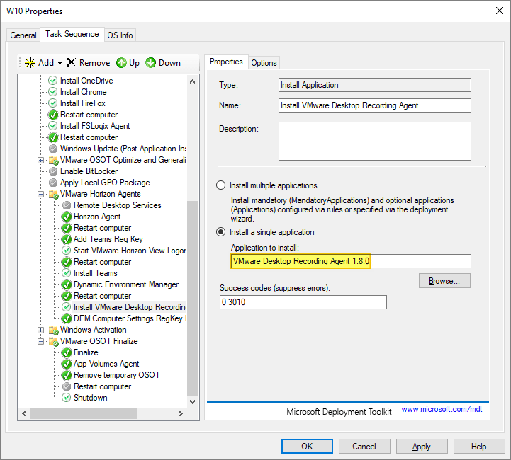 As I’ve gone over to using MDT to create Horizon templates, described here: Automating Template Creation & Maintenance, I will update the Horizon Recording Agent in the Deployment Share, and run through the task sequence, to create a new template. Before I begin, I open the task sequence and can see that it has found the 1.7.8 Agent in the Deployment Share.