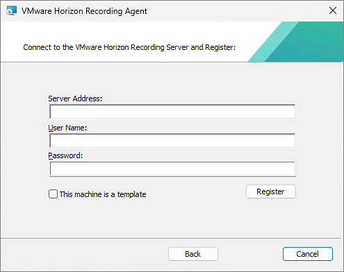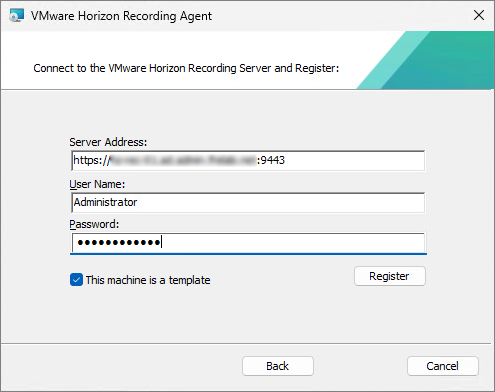 The following page is important, here we are providing the connection details and register the machine as a template with the Recording server. As described by VMware in the documentation: Using VMware Horizon Recording, I will need to provide the following: