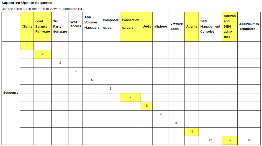 Anyhow, in this section I will describe how I upgraded my VMware Horizon infrastructure to v. 2206. But first, at what point in an upgrade procedure should we upgrade the VMware Horizon Components? According to VMware’s official documentation, this should be done as shown below.