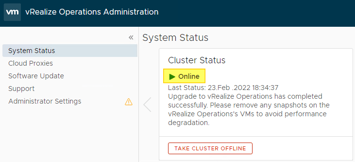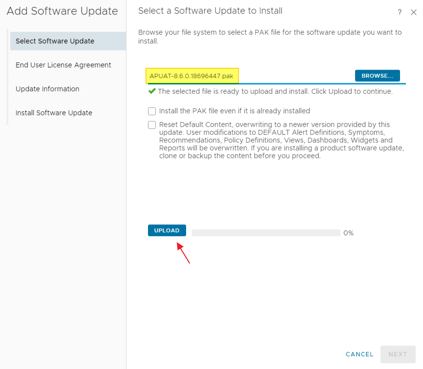 Once the cluster is offline, I can start the actual upgrade process. It is best practice to install and run the Pre-Upgrade Assessment Tool before upgrading vRealize Operations Manager.