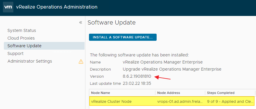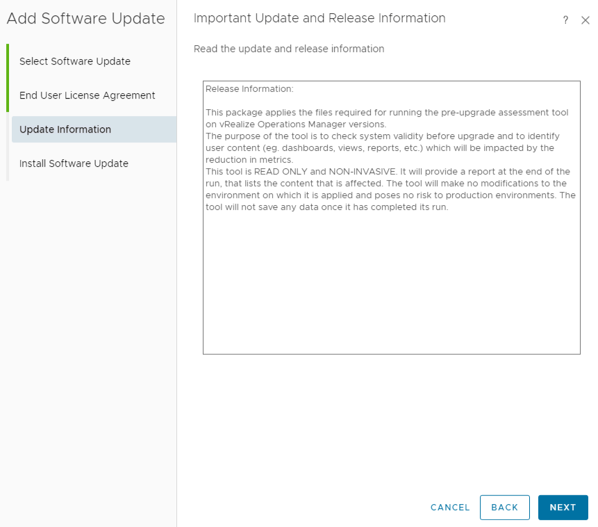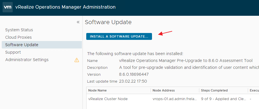 Once I have run the Pre-Upgrade Assessment Tool and verified that the upgrade is safe, I start the actual vRops upgrade process