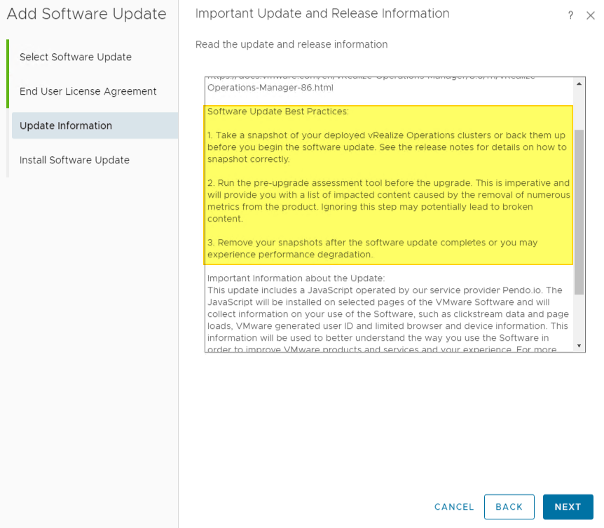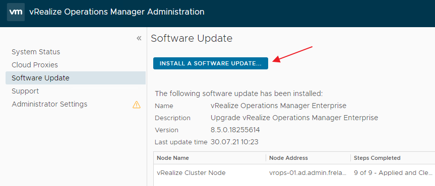 Once I have run the Pre-Upgrade Assessment Tool and verified that the upgrade is safe, I start the actual vRops upgrade process