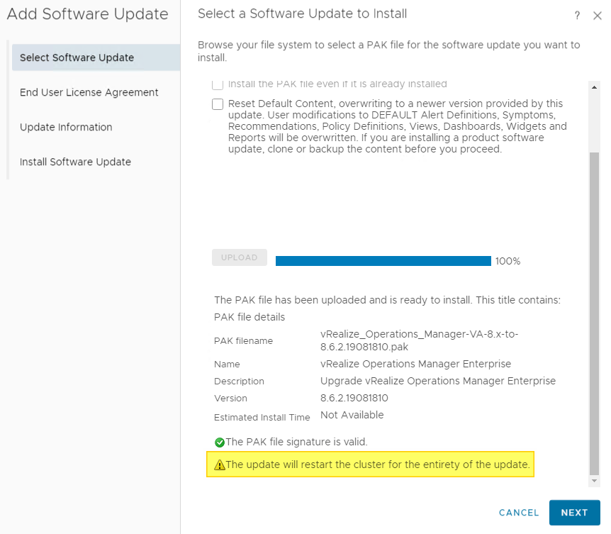 Once the cluster is offline, I can start the actual upgrade process. It is best practice to install and run the Pre-Upgrade Assessment Tool before upgrading vRealize Operations Manager.