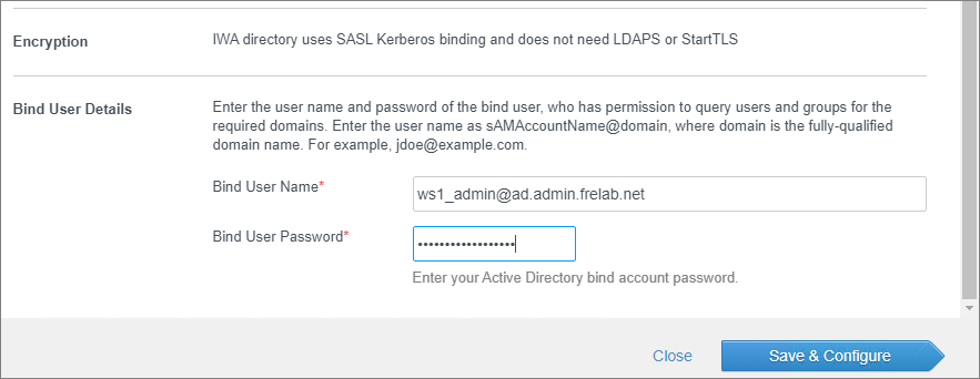 I provide the necessary details for the new directory and enter the credentials I use to Bind to MS Active Directory, Save & Configure…
