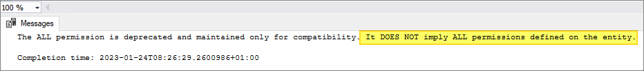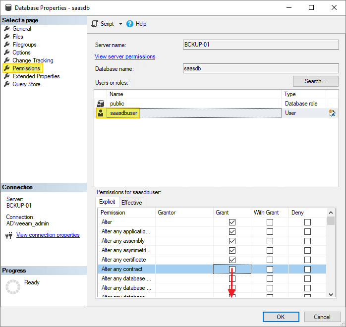 From the Permissions-section, I grant my sql-user ALL permissions on the database, OK…