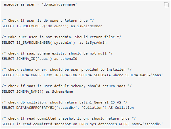 I will be using my existing database-server in my internal network. Therefore I open the TCP port 1433 in my firewall from the DMZ ip-address of the VMware Workspace ONE Access appliance to the SQL-server. I also have to decide which authentication to use, SQL or Windows AD-integrated? In my case this will be Windows AD-integrated. I first create a user in Active Directory and make sure the password for this user doesn’t expire. VMware have prepared a nice example-query which will create the database, the schema and assign the user the necessary permissions, documented here: Create the Workspace ONE Access Service Database (v.22.09). As stated by VMware, I note the requirements for the username syntax.