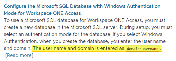 I will be using my existing database-server in my internal network. Therefore I open the TCP port 1433 in my firewall from the DMZ ip-address of the VMware Workspace ONE Access appliance to the SQL-server. I also have to decide which authentication to use, SQL or Windows AD-integrated? In my case this will be Windows AD-integrated. I first create a user in Active Directory and make sure the password for this user doesn’t expire. VMware have prepared a nice example-query which will create the database, the schema and assign the user the necessary permissions, documented here: Create the Workspace ONE Access Service Database (v.22.09). As stated by VMware, I note the requirements for the username syntax.