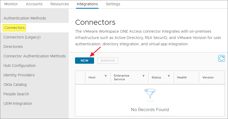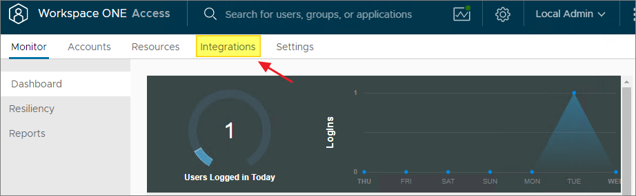 To start off, I will be creating a configuration-file in Workspace ONE Access. From the top menu I select Integrations