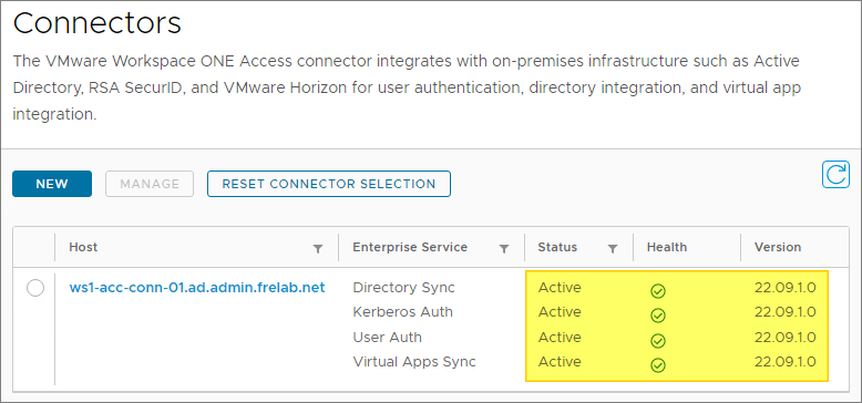 I also verify that the Status and Health for the connector show up as Active and in good condition in Workspace ONE Access.