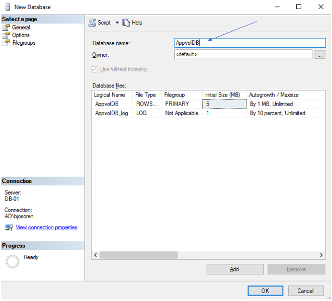 I give the database a name, in this case it will be the App Volumes database, so I’ll call it AppvolDB