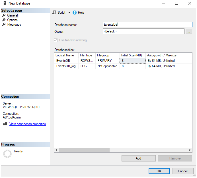 Give the database a name, in this case this will be the Events-database for the Connection-server, so I’ll call it EventsDB