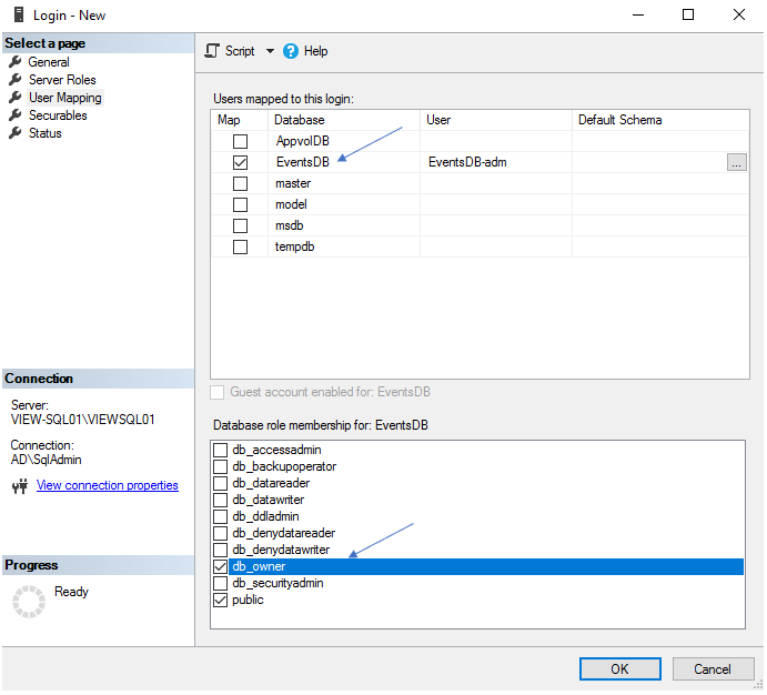 I map my user to my newly created EventsDB database and give the user db_owner membership for this database.