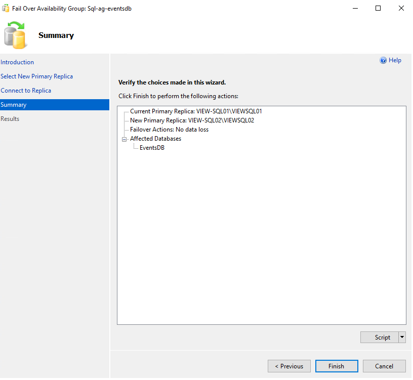 To test failover for my EventsDB I click Failover on my SQL-ag-eventsdb Availability Group