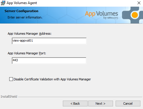 I enter the FQDN of my App Volumes Manager server, 443 is correct, Next
