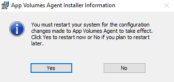 When the App Volumes Wizard completes successfully, click Finish and Yes to Restart server