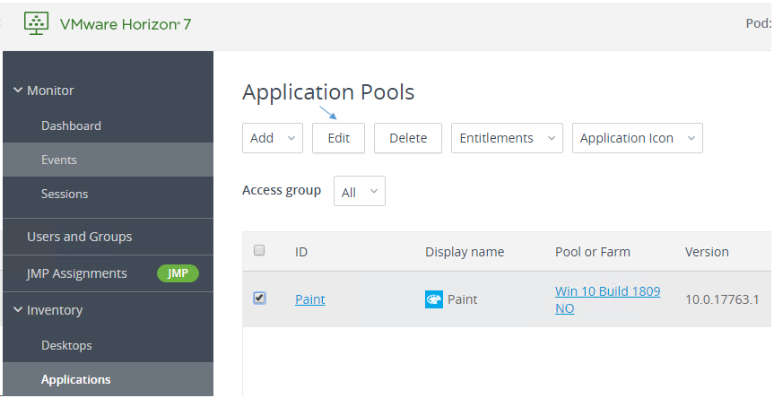 In order to allow application-pool creation from a Windows 10 based desktop pool, we first have to enable this functionality in «newadmin» on an existing Desktop Pool. I select an existing desktop pool, Edit…