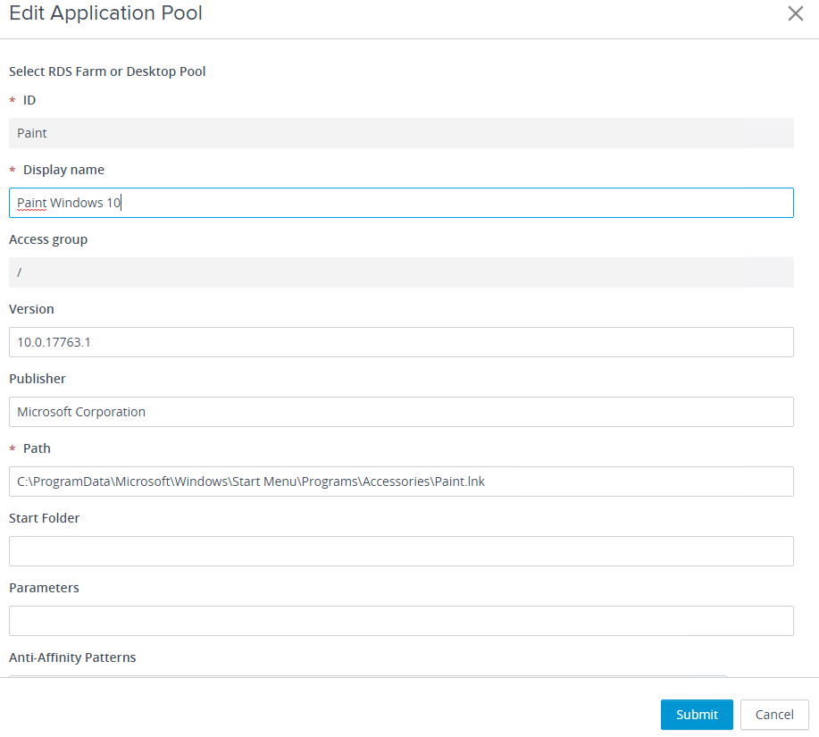 In order to differentiate this application pool for the users, I will rename shortcut to «Paint Windows 10». I select “Paint” and click “Edit”