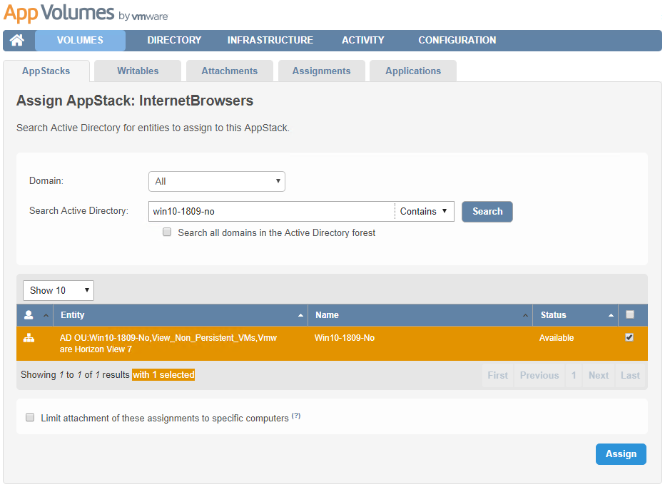 In App Volumes Manager, I select the AppStack and click “Assign”…